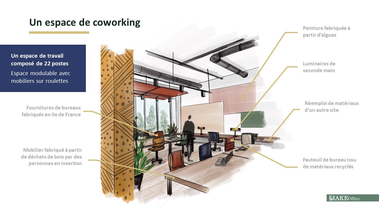 Dans cet espace de travail ouvert harmonieux dans lequel il est agréable de travailler, l’ensemble du mobilier et des matériaux choisit pour cet espace respecte les valeurs éco- responsable de MAKE It Green :