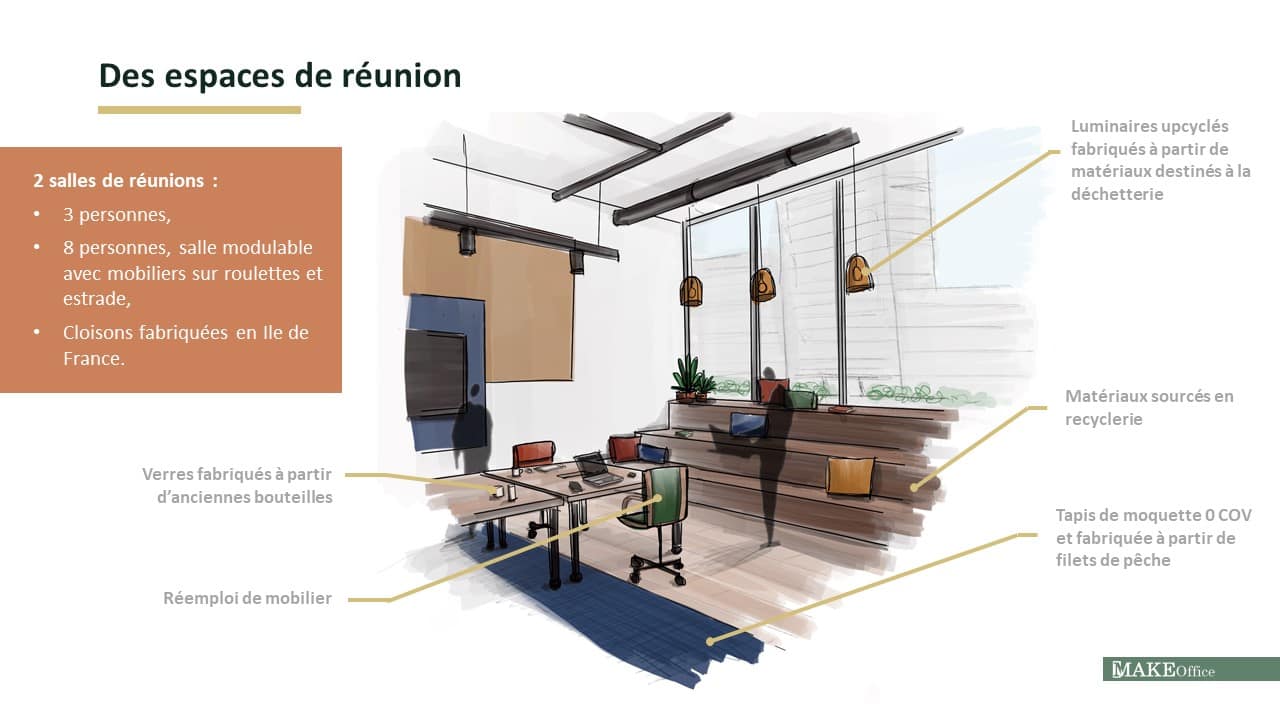 Grâce à un mobilier issu du réemploie, des luminaires upcyclés et fabriqués à partir de matériaux destinés à la déchetterie, ou encore un tapi de moquette fabriqué à partir de filet de pêche. Ces salles permettent d’assurer un environnement de travail complet et agréable.